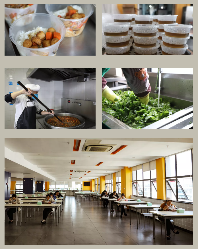 食堂工作人员自己全面做好防控措施的同时,,严把原材料关,,保证饭菜制作全过程安全、、、卫生。。。。午餐采取各楼层配餐方式,,,谢绝外部人员进入用餐、、杜绝外卖送餐。。。在餐厅用餐者需二次量体温,,,隔位入座用餐。。。。