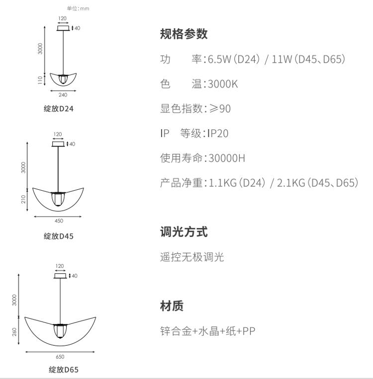 利用材料物理弹性,,,透过巧妙的结构,,,,灯罩在空间里呈现一个富有张力和生机的曲面,,仿佛在空间里热烈绽放的花朵,,灯罩表面采用手工敷纸工艺,,,更加的朦胧舒适,,,纸纤维的材质也让灯光更加温柔。。选用实心高级无铅水晶材质,,,,这种材料洁净无瑕的透明度与低色散特性,,,,硬度高,,,多用于精密光学器件及高端水晶制品,,,更好展现丰富光影质感。。